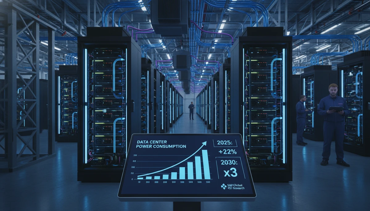 인공지능(AI) 기술의 발전과 함께 데이터센터의 전력 소비량이 급증하고 있다는 소식이 전해졌습니다. 특히 미국의 하이퍼스케일 데이터센터들은 2025년 말까지 전년 대비 22% 더 많은 전력을 소비할 것으로 예상되며, 2030년에는 현재의 약 3배에 달하는 전력을 필요로 할 것이라는 전망이 나왔습니다. 이는 S&P 글로벌(S&P Global)의 일부인 451 리서치(451 Research)의 보고서에서 밝혀진 내용입니다.